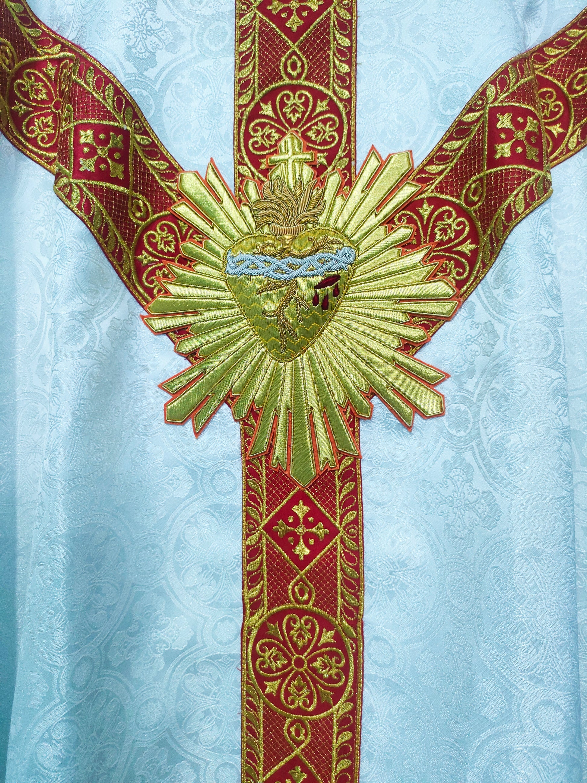 Centered on the chest, a beautifully crafted Sacred Heart appliqué—painstakingly embroidered by hand—adds a deeply symbolic focal point.