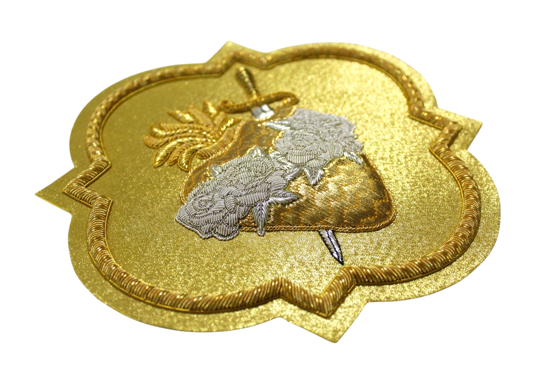 Enhance the elegance of your Catholic vestments with this stunning Immaculate Heart of Mary appliqué. Expertly crafted with fine goldwork and intricate bullion embroidery, this piece is a testament to exceptional craftsmanship.