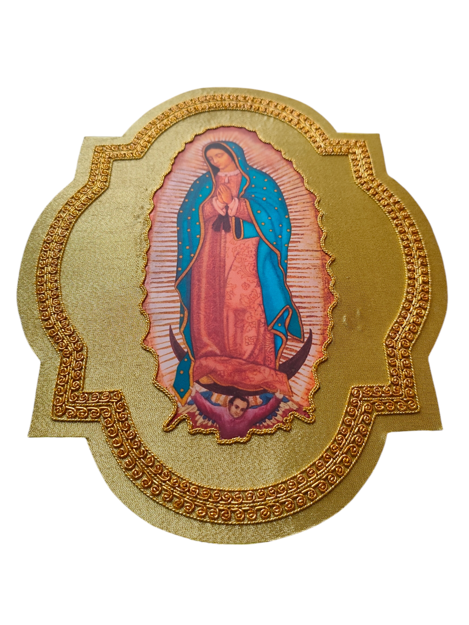 This exquisite Our Lady of Guadalupe appliqué is a stunning combination of hand embroidery and hand printing, crafted with gold bullion wire on luxurious gold fabric. Designed for Catholic vestments, this appliqué radiates divine beauty, making it perfect for chasubles, copes, altar frontals, and other liturgical garments.