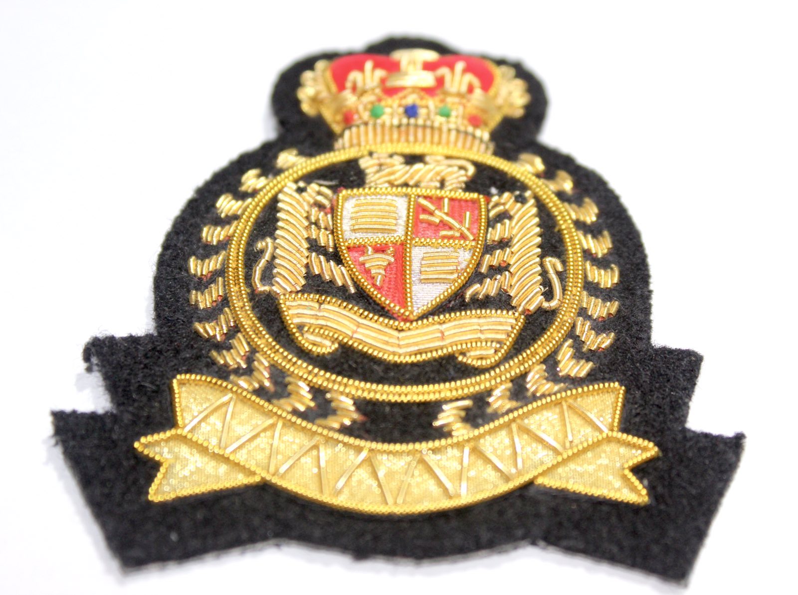 This elegant hand-embroidered pocket patch is a perfect emblem for blazers, jackets, uniforms, and club attire. Intricately crafted with gold bullion wire embroidery, it showcases a regal crest design, adding a touch of sophistication and prestige.