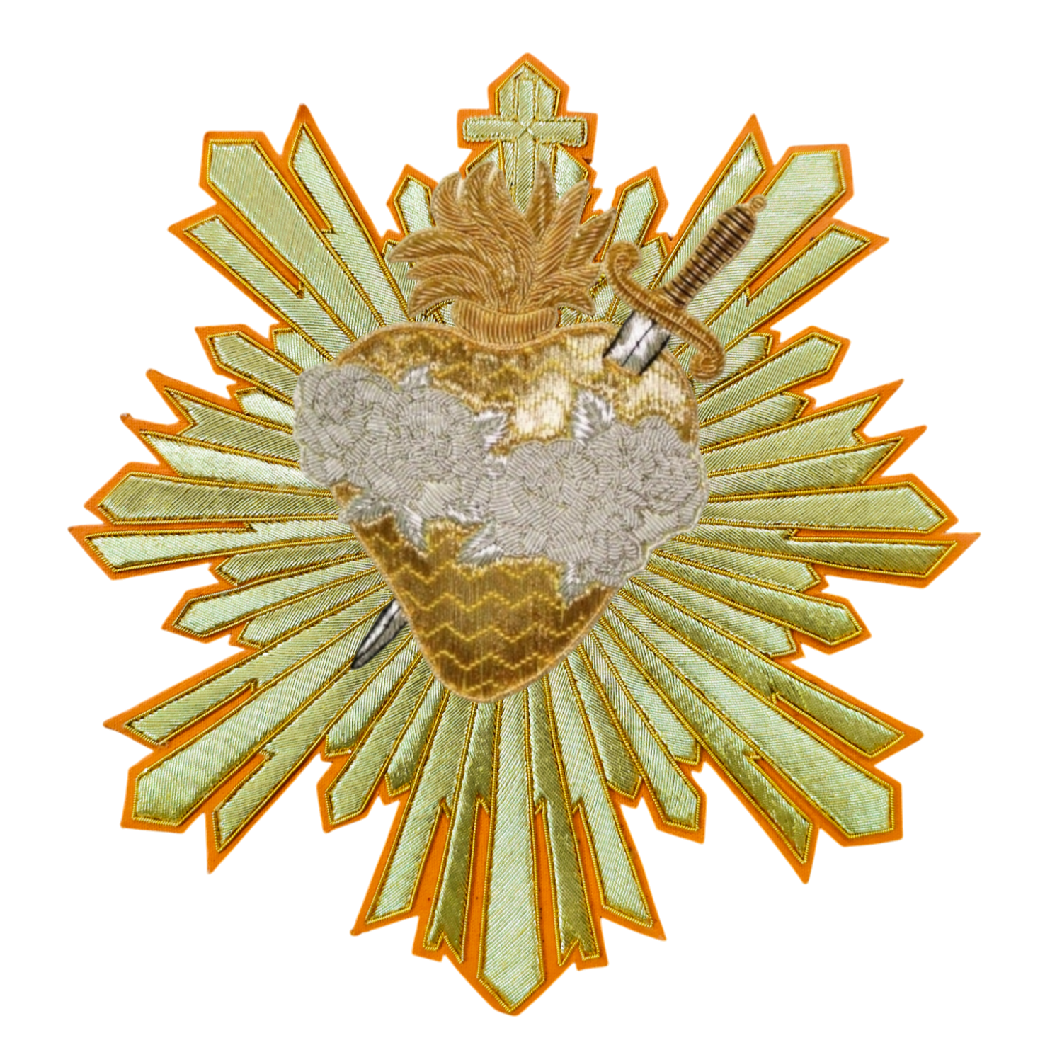 Honor the Blessed Virgin’s pure and sorrowful heart with a radiant appliqué that lifts both the eyes and the soul to heaven.