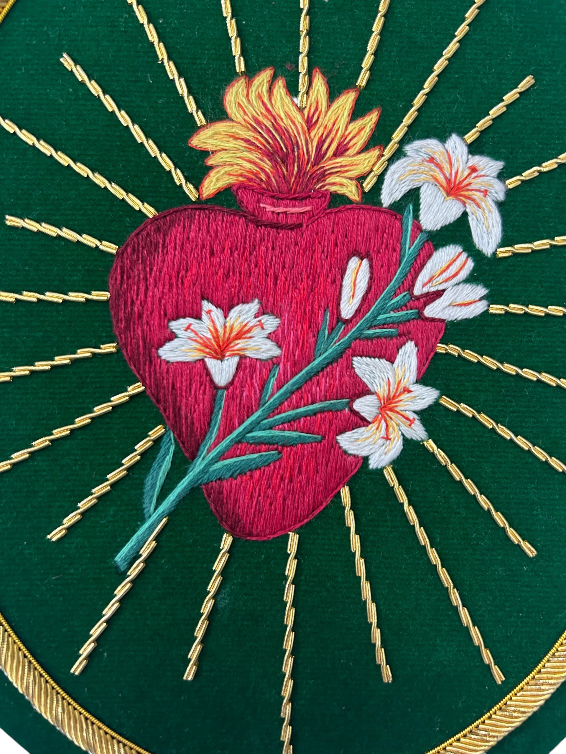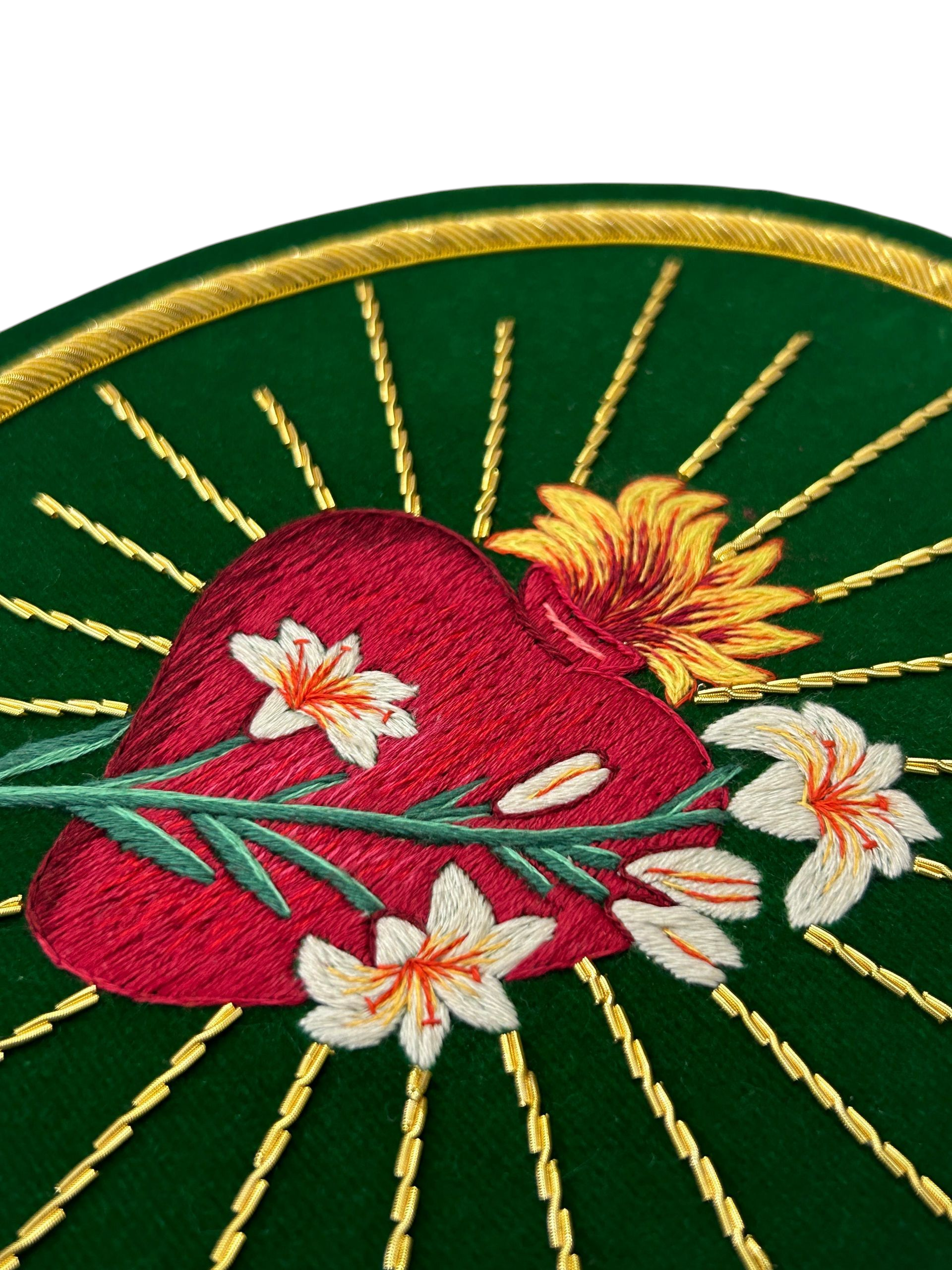 This sacred hand-embroidered appliqué depicts the Most Chaste Heart of St. Joseph, beautifully crafted on deep green velvet. A symbol of purity, humility, and paternal care, this unique design is a tribute to St. Joseph’s immaculate heart and his divine role in the Holy Family.