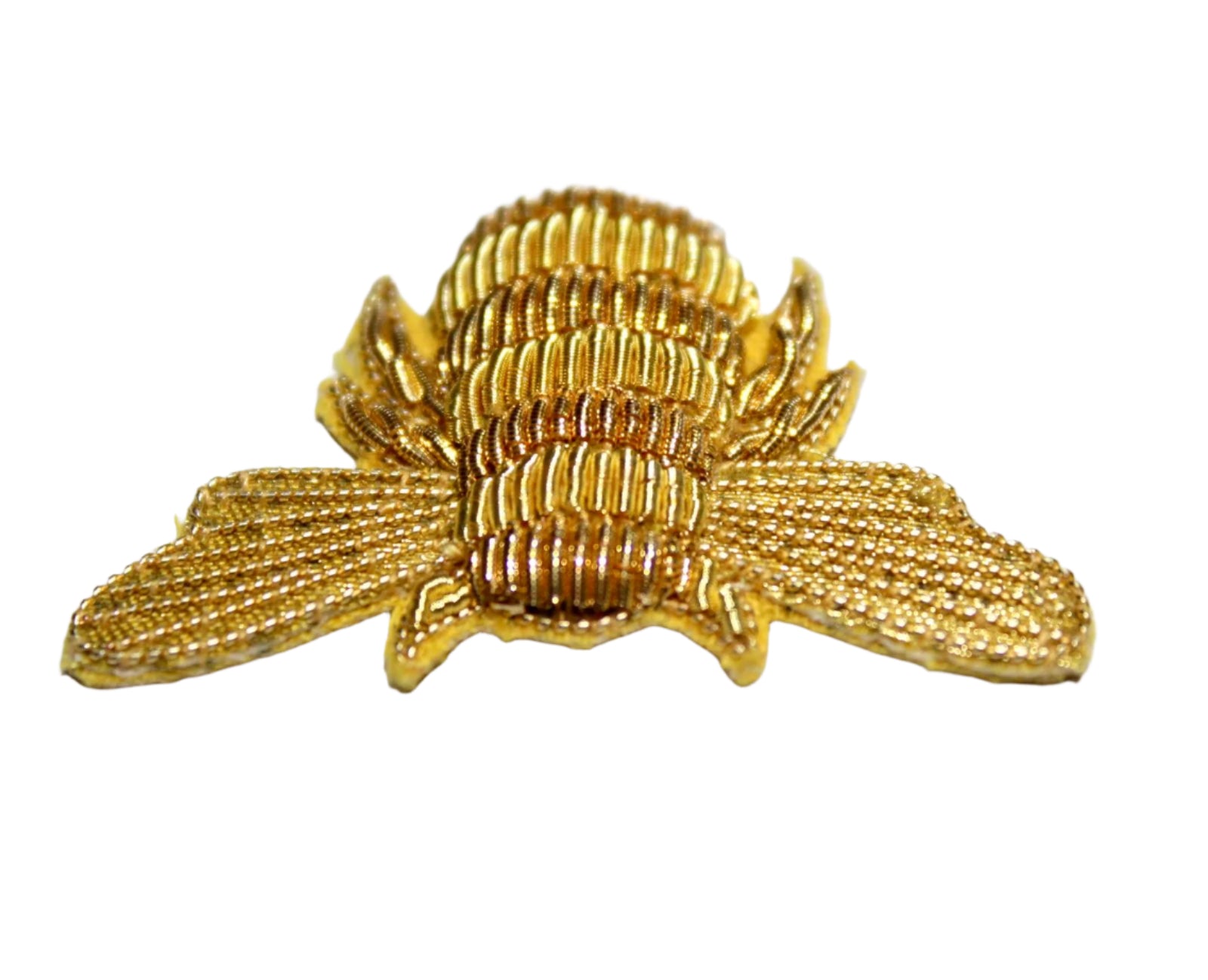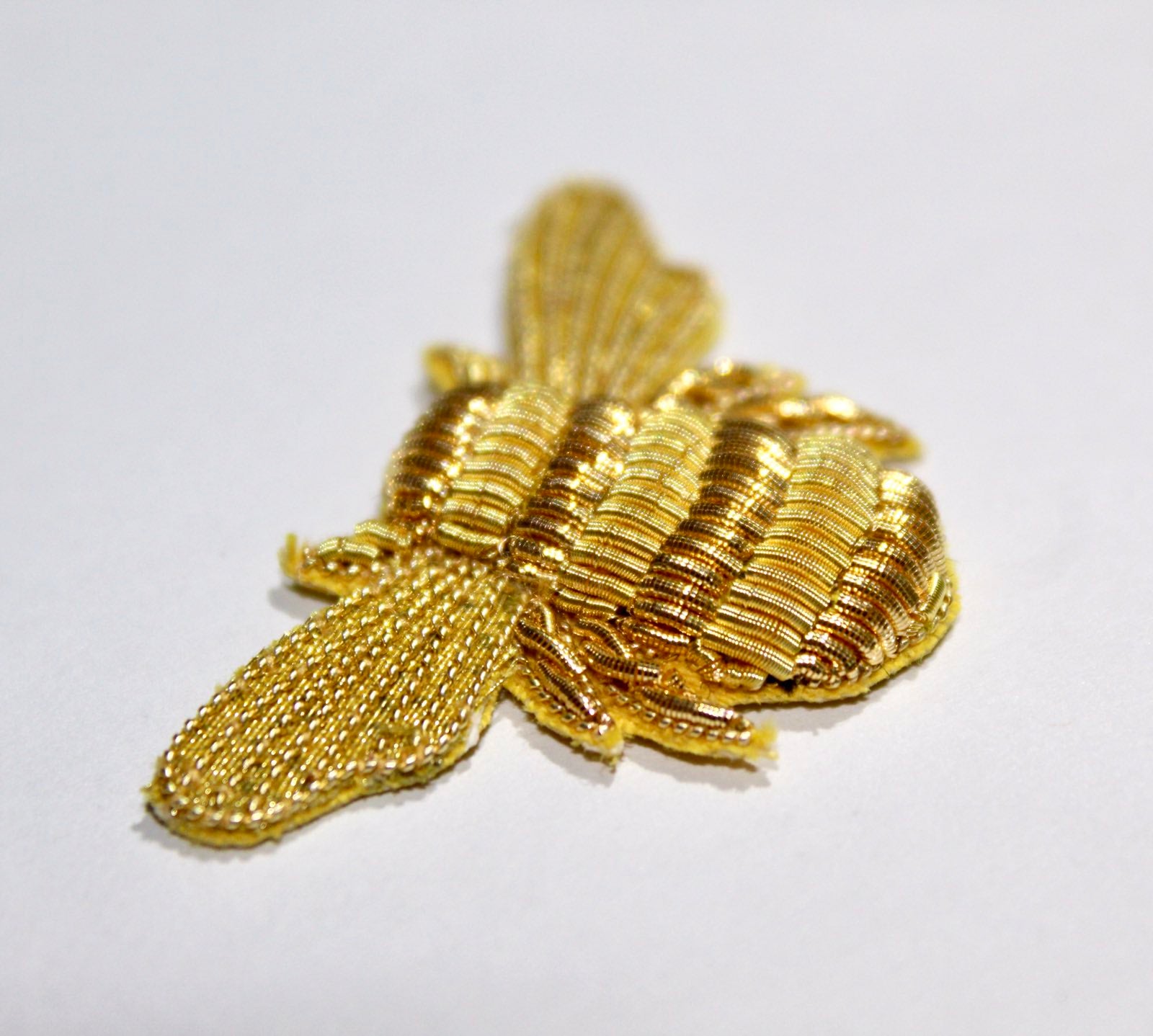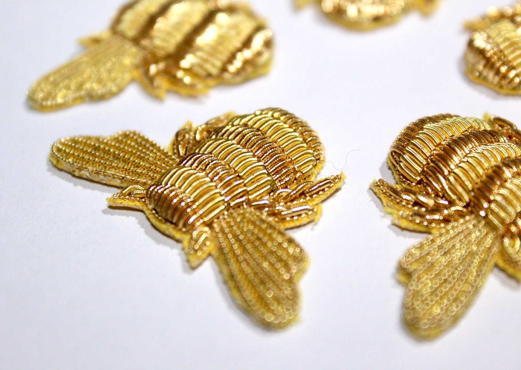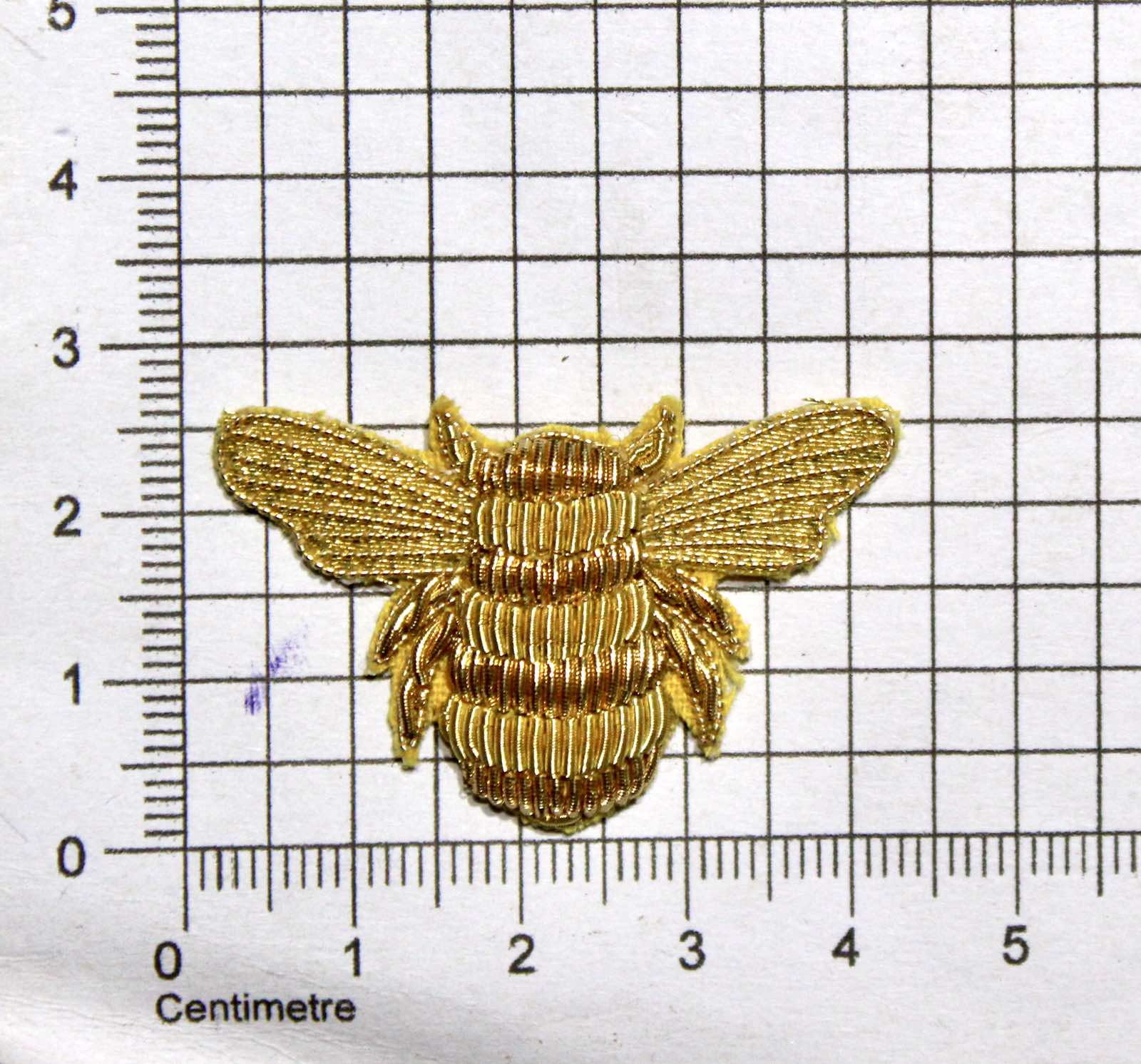 Add a touch of elegance to your attire with this gold bullion hand-embroidered bee patch set. Order now to elevate your fashion creations!